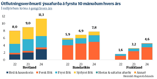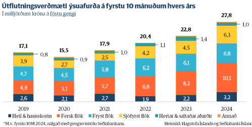 Á fyrstu tíu mánuðum ársins er útflutningsverðmæti ferskra ýsuflaka komið í rúma 10 milljarða króna, en það hefur aldrei verið meira á tilgreindu tímabili. Miðað við sama tímabil í fyrra er um 22% aukningu að ræða á föstu gengi. Vissulega hefur dágóð aukning einnig orðið á útflutningsverðmæti annarra afurðaflokka á milli ára. Þannig hefur útflutningsverðmæti frystra flaka aukist um 12% og verðmæti sjófrystra flaka um 40%. En þegar litið er aftur til ársins 2019, þá hefur langmesta aukningin orðið í útflutningsverðmæti ferskra afurða, en þau hafa ríflega tvöfaldast á tímabilinu. Þetta endurspeglar vel þá staðreynd að sjávarútvegsfyrirtæki eru stöðugt að leita leiða til þess að auka verðmætasköpun, eins og með þróun verðmætari afurða úr ýsu.