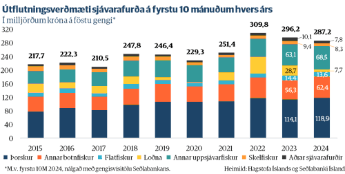 Á fyrstu tíu mánuðum ársins er útflutningsverðmæti sjávarafurða komið í rúma 287 milljarða króna. Það er um 3% samdráttur miðað við sama tímabil í fyrra, reiknað á föstu gengi. Vart þarf að nefna að þennan samdrátt má að langstærstum hluta skrifa á loðnubrest í ár. Að loðnuafurðum undanskildum, þá hafa útflutningsverðmæti sjávarafurða aukist um rúmlega 4%.