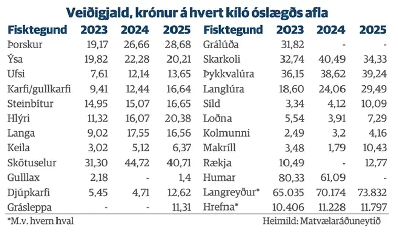 Hvað veiðigjald mun skila ríkissjóði í ár fer eftir lönduðum afla á síðustu tveimur mánuðum ársins. Reikna má þó með að fjárhæð veiðigjaldsins í ár endi í rúmum tíu milljörðum króna og verði þar með á svipuðu róli og í fyrra. Á næsta ári má hins vegar reikna með að fjárhæð veiðigjaldsins verði töluvert hærri og í raun má reikna með að tekjur ríkissjóðs af veiðigjaldi verði þær mestu frá upphafi. Það má lesa úr auglýsingu sem matvælaráðuneytið birti í Stjórnartíðindum í síðustu viku um veiðigjald fyrir árið 2025. Gjaldið er auglýst sem krónur á kíló landaðs óslægðs afla en sú upphæð er nákvæmlega 33% af afkomu fiskveiða á árinu 2023. Ljóst er að upphæð veiðigjaldsins hækkar nokkuð myndarlega á milli ára á langflestum fisktegundum og er hækkunin sérlega mikil á uppsjávartegundum líkt og sjá má í töflunni hér fyrir neðan.