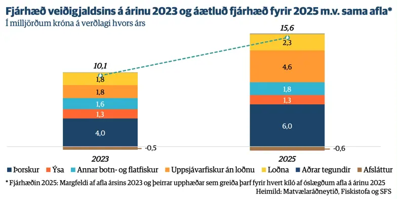 Til þess að setja þessar upphæðir sem útgerðir þurfa að greiða á næsta ári í samhengi er ágætt að bera það saman við árið 2023. Þá er heilt ár undir, auk þess sem loðnukvóti var gefinn út það ár. Á myndinni hér fyrir neðan má sjá hver fjárhæð veiðigjaldsins var eftir tegundum á árinu 2023 og hver fjárhæð þess yrði á árinu 2025 ef aflinn á því ári yrði nákvæmlega hinn sami fyrir hverja einustu fisktegund og á árinu 2023. Það er vissulega óraunhæft að reikna með því, enda eru miklar sveiflur í afla einstaka fisktegunda frá einu ári til annars af fjölmörgum ástæðum. En ef sú yrði raunin myndu útgerðir greiða um 15,6 milljarða króna í veiðigjald á árinu 2025, eða ríflega helmingi meira en þær greiddu á árinu 2023. Sé veiðigjald af loðnu undanskilið, yrði fjárhæðin 13,3 milljarðar árinu. En hver fjárhæðin verður á næsta ári ríkir eðlilega mikil óvissa um og þá ekki síst varðandi útgáfu loðnukvóta á yfirstandi fiskveiðiári.