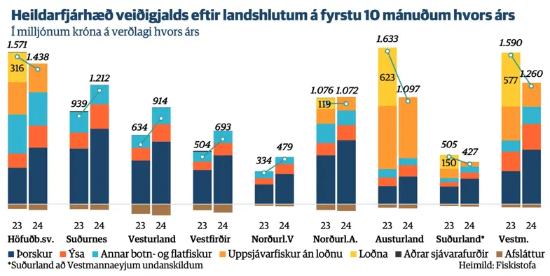 Á myndinni má sjá að heildarfjárhæð veiðigjaldsins í ár er lægri á fyrstu tíu mánuðunum í ár en í fyrra í öllum landshlutum sem reiða sig á uppsjávarveiðar. Þar blasir jafnframt við að þá lækkun megi fyrst og fremst rekja til loðnubrests í ár. Sé veiðigjald af loðnu hins vegar undanskilið, þá hafa útgerðir á öllum þessum svæðum greitt töluvert hærri fjárhæð í veiðigjald í ár en í fyrra. Útgerðir á Suðurnesjum, Vesturlandi, Vestfjörðum og Norðurlandi vestra reiða sig nær eingöngu á botnfiskveiðar. Þar hefur heildarfjárhæð veiðigjaldsins hækkað nokkuð myndarlega á milli ára í öllum tilvikum.